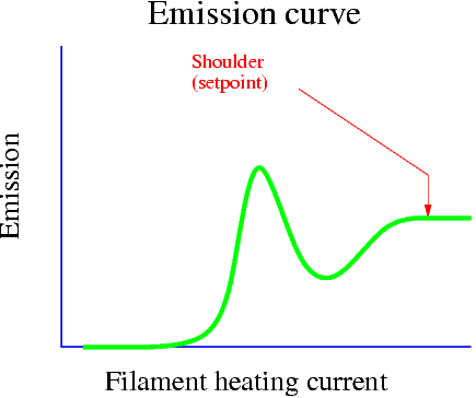 - Slowly turn filament heating current to the indicated value (at the 'shoulder', see plot. do not exceed 2.6A. Ask if unsure)